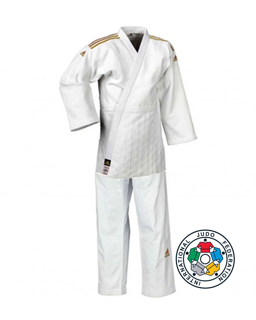 Judo Gi para adultos, con tela de grano tradicional y rayas Adidas. Cómodo, resistente, con cuello acolchado y pantalón 100% algodón con rodillas reforzadas. Alta calidad para practicantes exigentes.