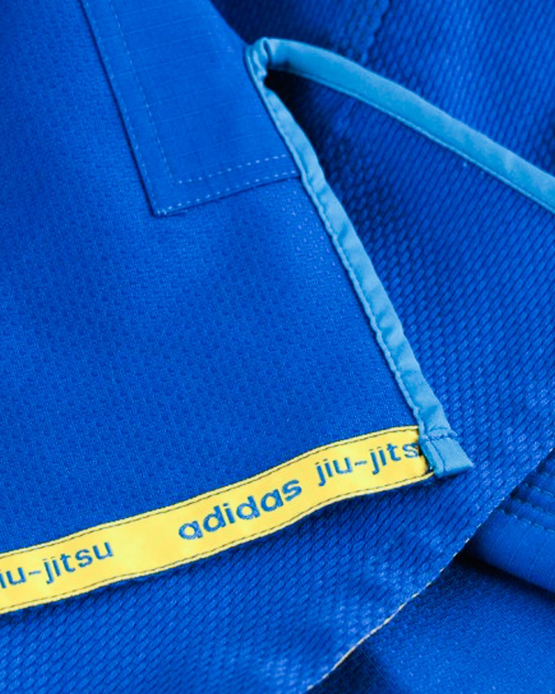 Kimono Jiu-Jitsu Adidas Challenge 2.0 Azul, ideal para entrenamiento y competencia. Resistente y cómodo, con chaqueta y pantalón de mezcla poliéster/algodón, cintura elástica y refuerzos.